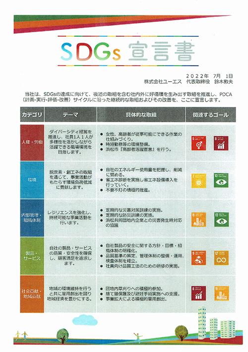 株式会社ユーエスは、社員が心身ともに元気に働ける職場を目指して健康づくりのため下記の事項に取り組みます。